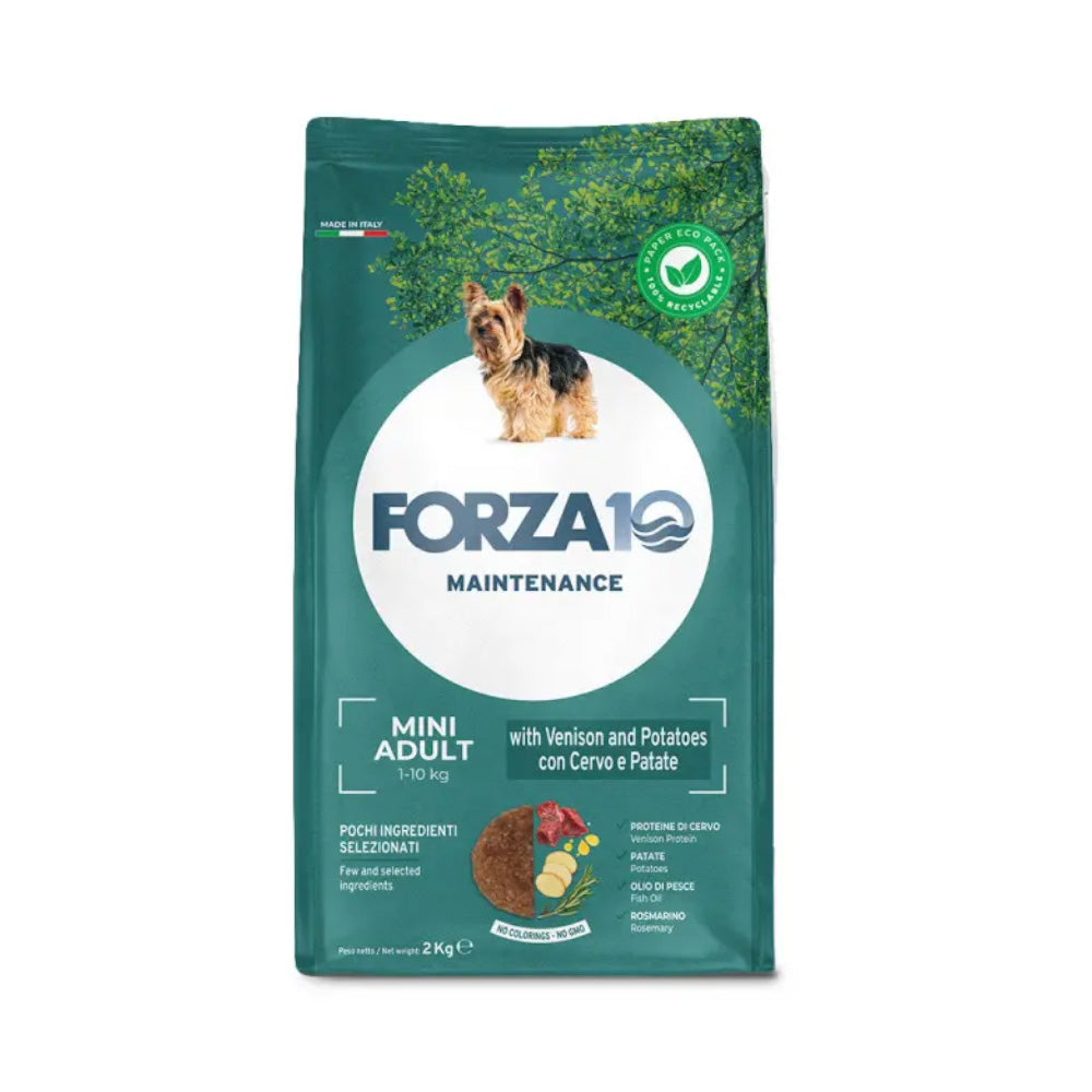 Do you have a question about this product?Forza10 Dry Food For Adult Mini in Venison And Potatoes specially designed to meet the needs of adult small breed dogs, featuring a delicious blend of deer and rich potatoes. Formulated to support digestive health, maintain optimal energy levels, and enhance skin and coat quality. A balanced meal enriched with essential nutrients to ensure the overall well-being of your pet.