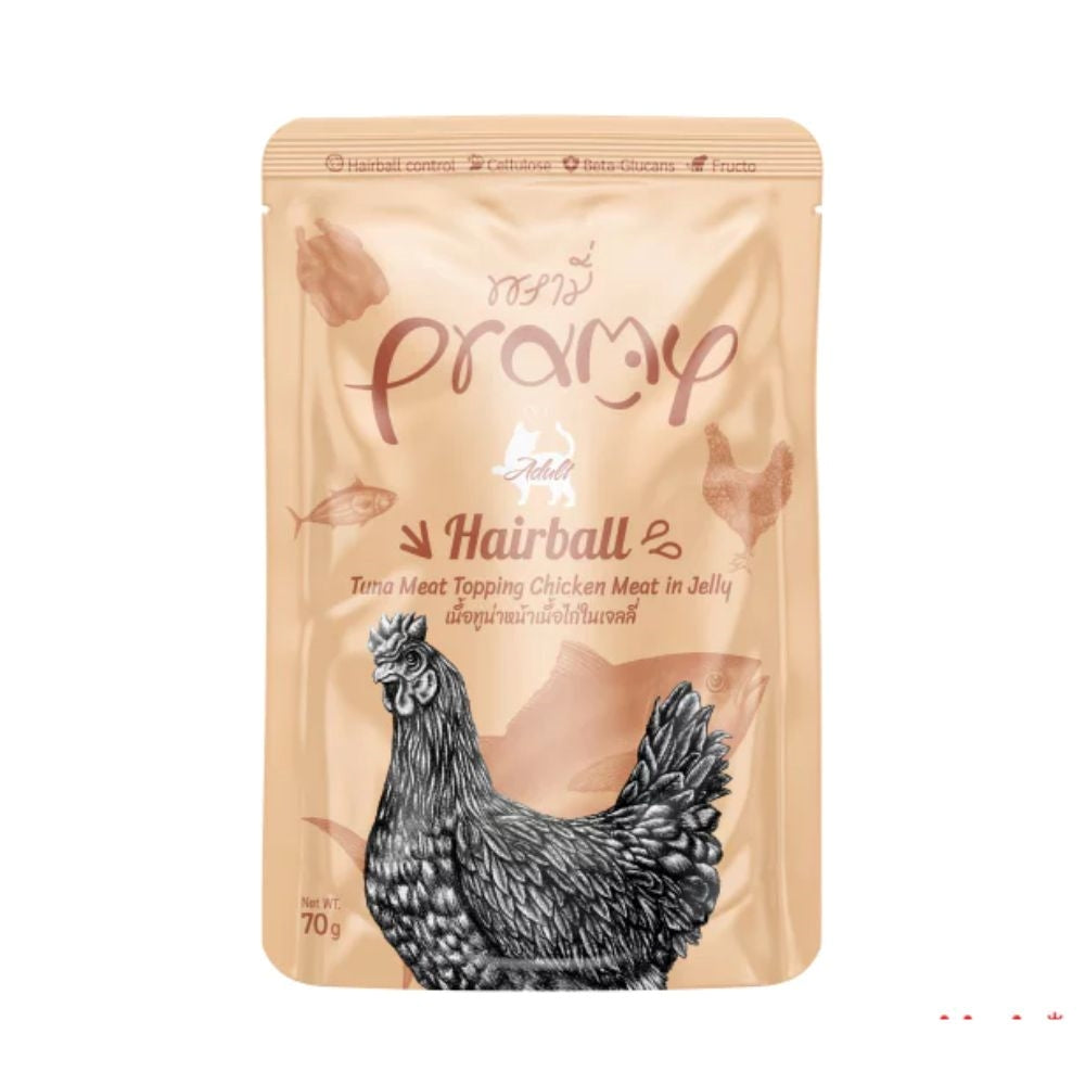Do you have a question about this product?Pramy Hairball Wet Food For Cats Tuna topping Chicken in Jelly is designed to support cats' health and prevent hairball formation. This recipe combines tuna and chicken, and is rich in fiber, helping hair pass through the digestive system and reducing hairball formation. It also promotes healthy skin and coat with Omega fatty acids.