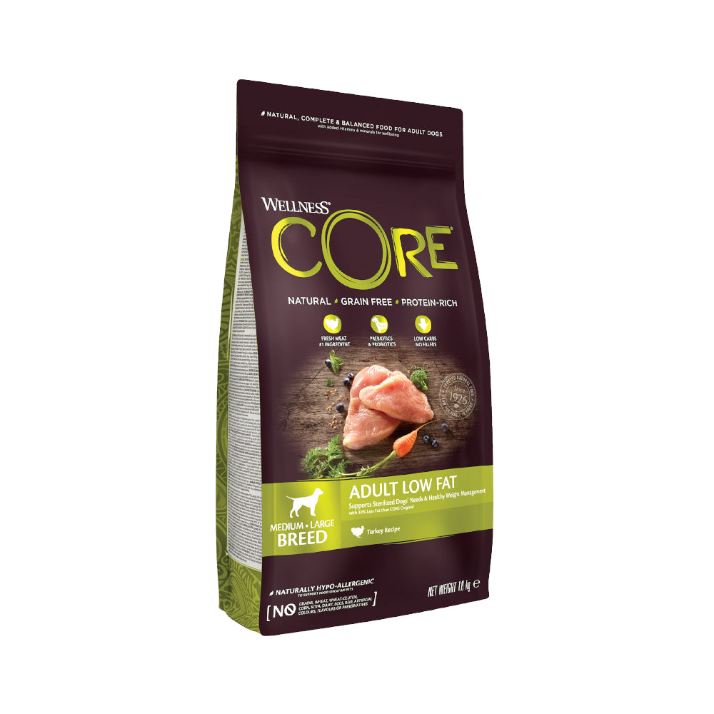 Do you have a question about this product?Wellness CORE Adult Low Fat Dry Dog Food For Medium and Large Breed With Turkey. A low-fat dry food for adult dogs, featuring high-quality protein sources like turkey and chicken. Grain-free formula supports healthy digestion and helps maintain an ideal weight. Enriched with natural ingredients like vegetables and fruits, and includes supplements for joint and skin health.