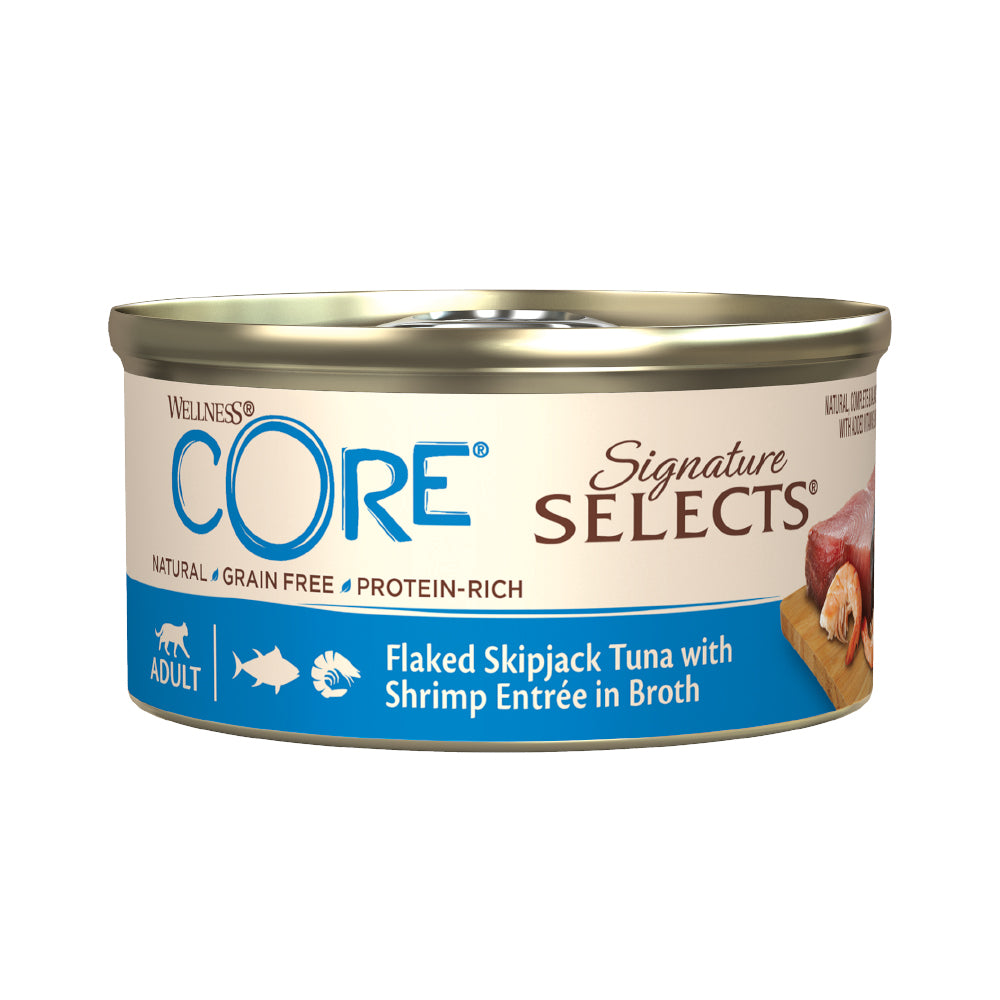 Do you have a question about this product?Wellness CORE Signature Selects Wet Food For Adult Cats With Tuna with Shrimp in Broth This meal features flaked skipjack tuna and salmon in a savory broth, making it ideal for cats that enjoy moist and flavorful food. The recipe is natural, grain-free, and easy to digest, supporting daily feline health with balanced nutrition and satisfying taste.